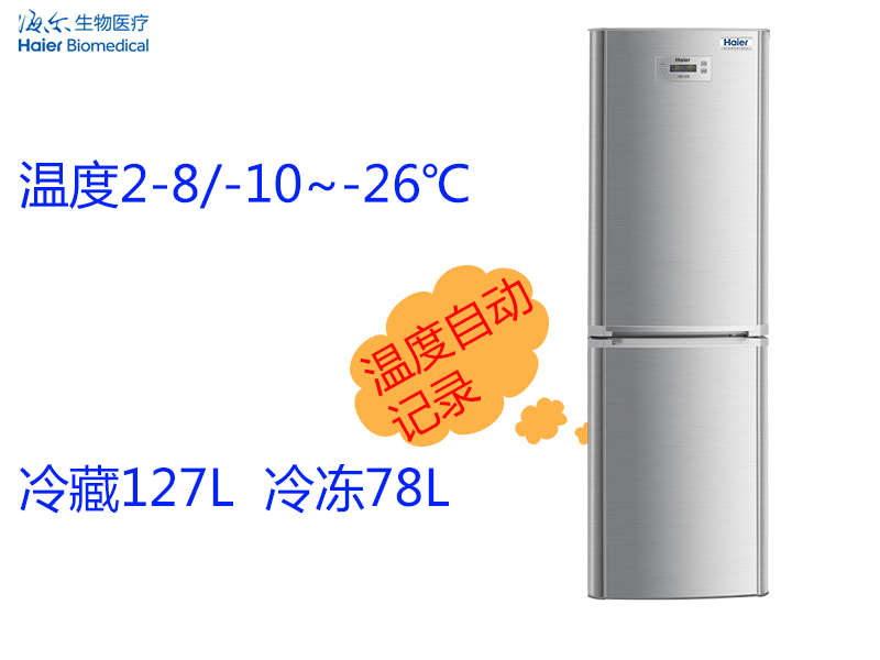 海爾藏冷凍保存箱HYCD-205,冷藏2~8℃ ,冷凍-10~-26℃;冷藏127L冷凍78L;冷藏室超大容量;冷凍室雙密封,保溫好; 內膽全不銹鋼;冷藏冷凍雙顯,冷藏室、冷凍室溫度顯示,一目了然;溫度自動記錄,自動存儲,帶U盤即插即用;高低溫、傳感器故障、斷電等多重自動聲光報警